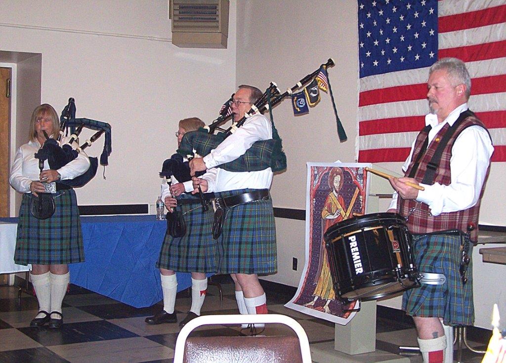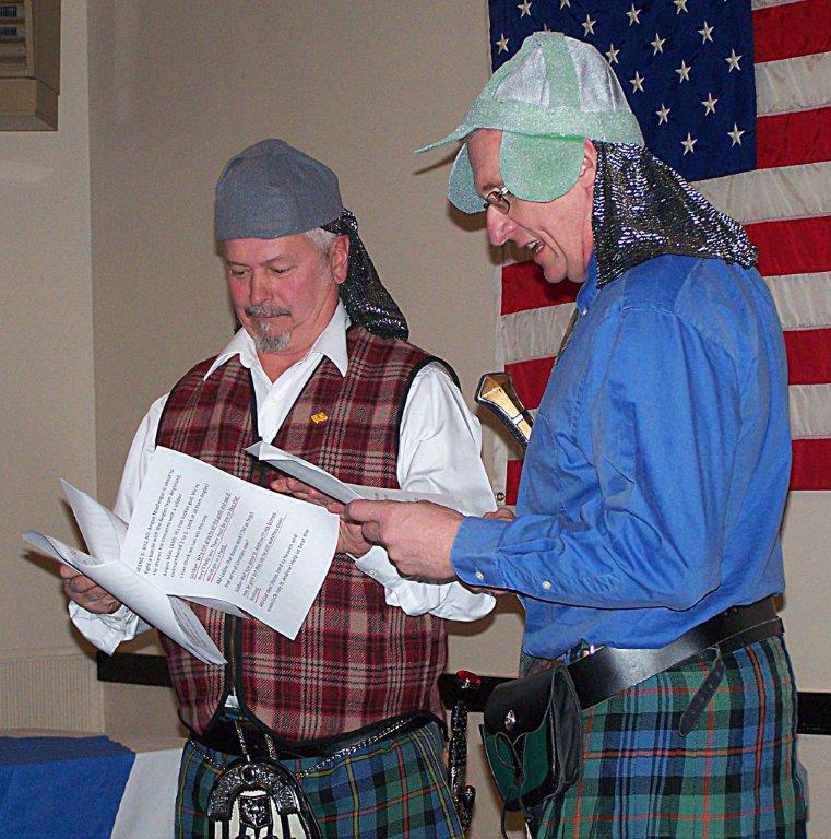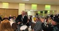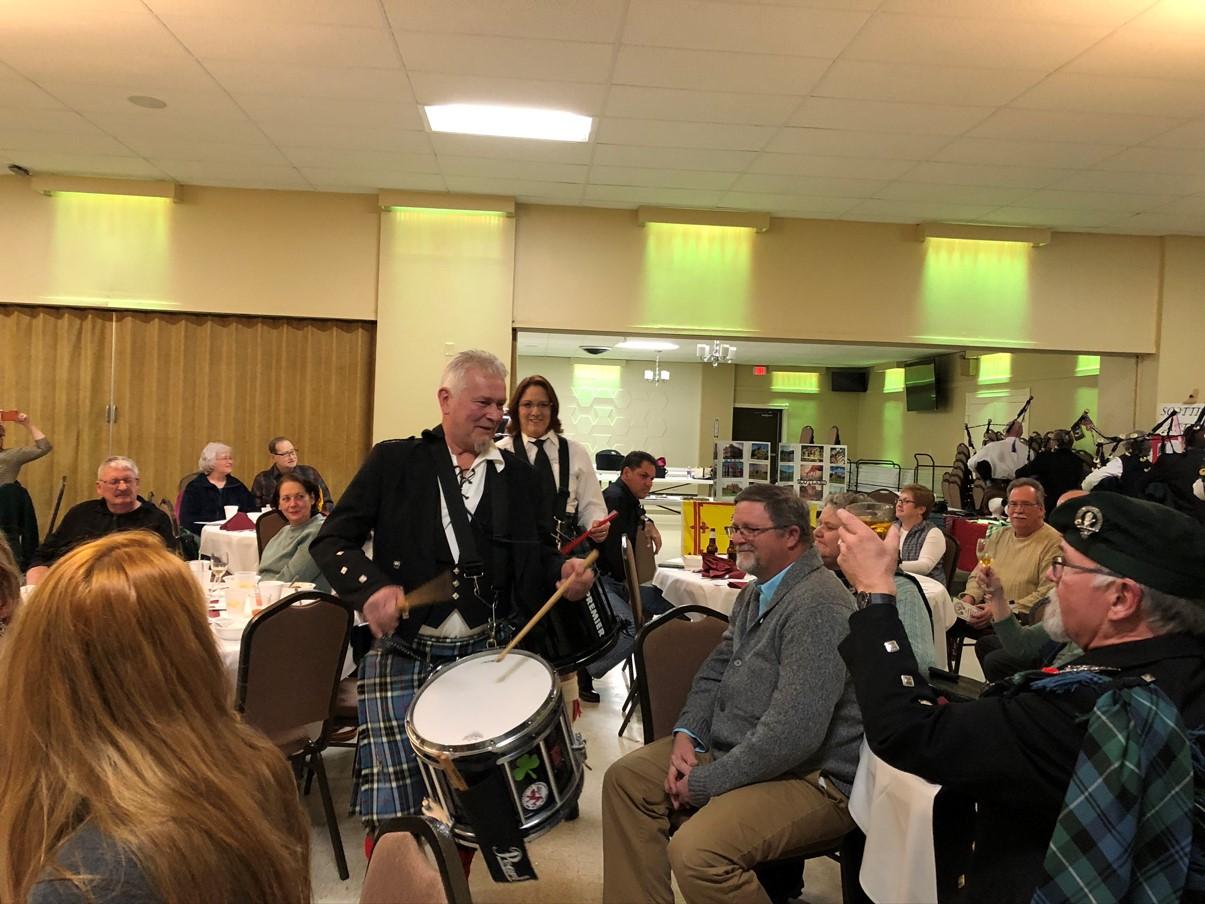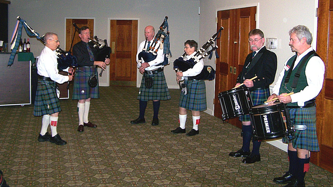 The Drama was followed by a selection of tunes by the Caledonian Pipes and Drums, and the audience was treated to a sprightly reel by the Chief, who vowed to do a repeat performance at the Burns Dinner…finally, Dr. Carl Johengen graced the gathering with comical Scottish folk songs about love and marriage.