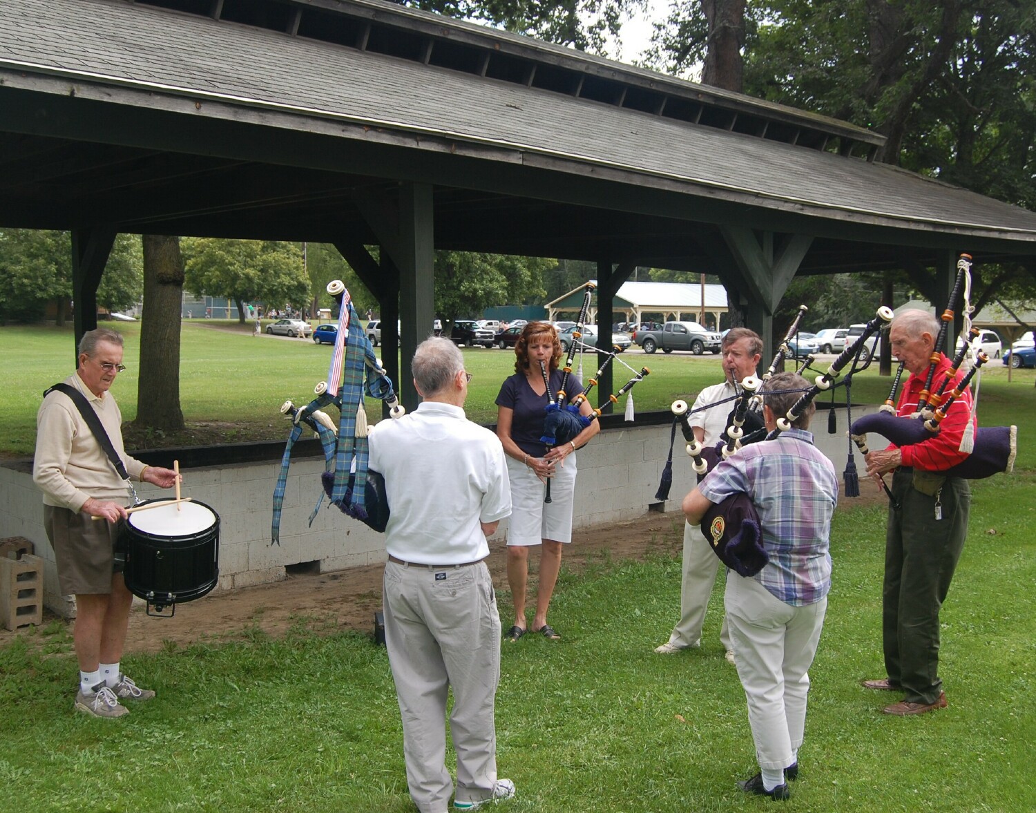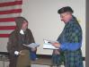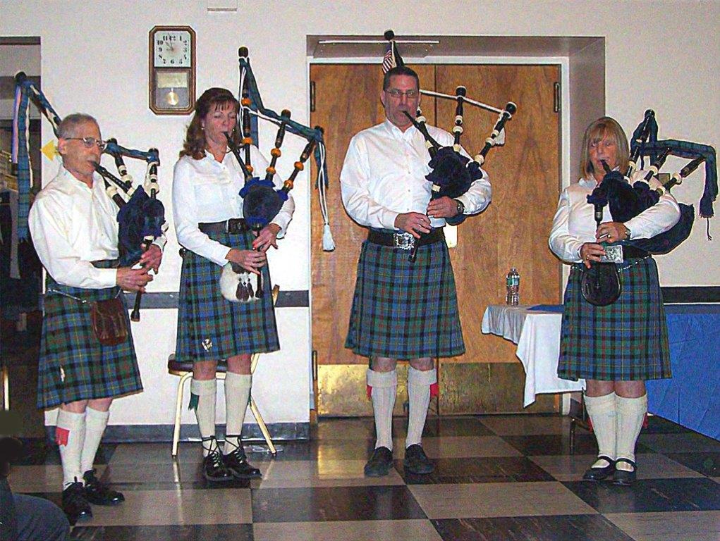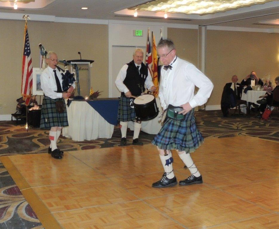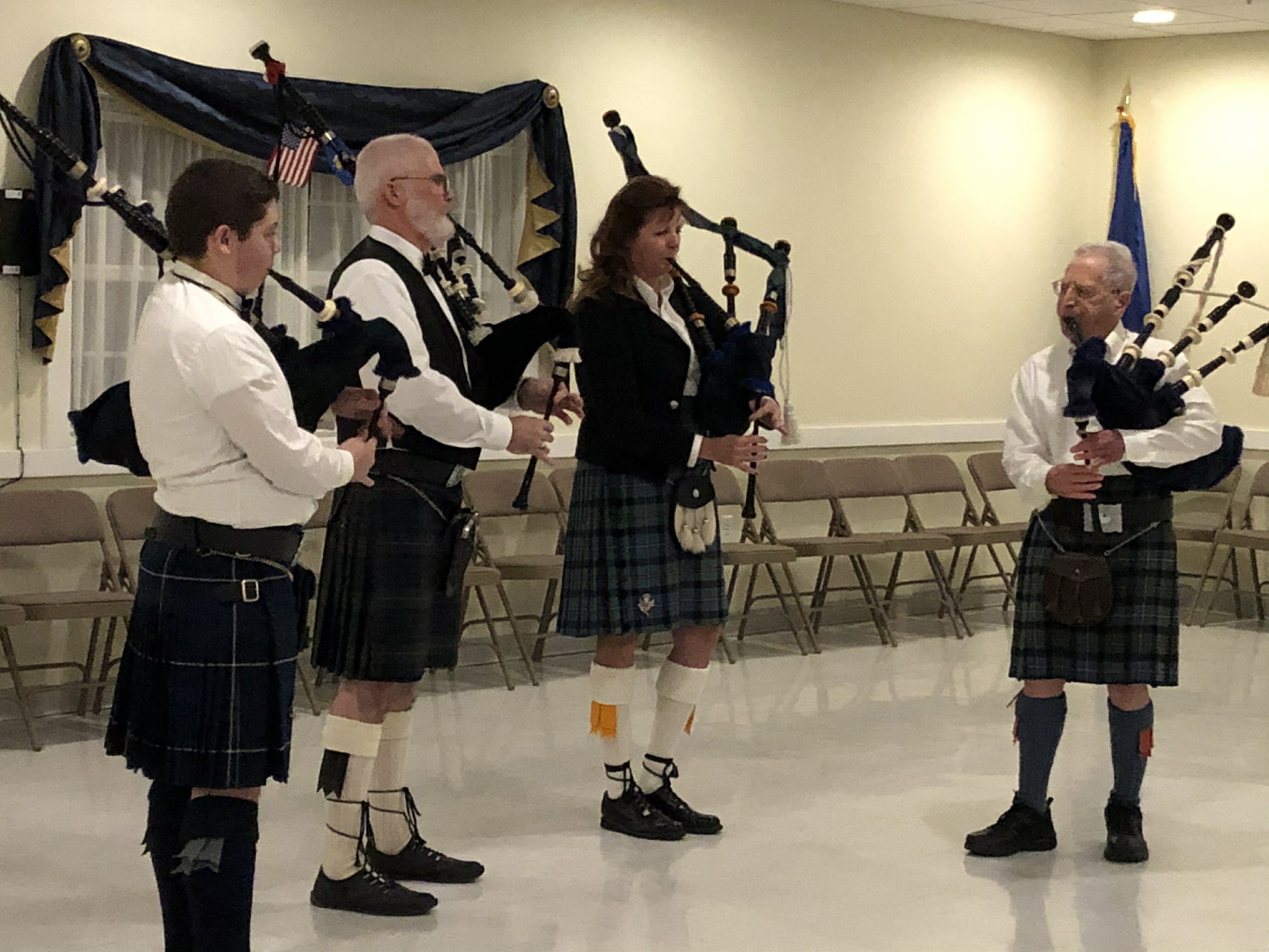 The Drama was followed by a selection of tunes by the Caledonian Pipes and Drums, and the audience was treated to a sprightly reel by the Chief, who vowed to do a repeat performance at the Burns Dinner…finally, Dr. Carl Johengen graced the gathering with comical Scottish folk songs about love and marriage.