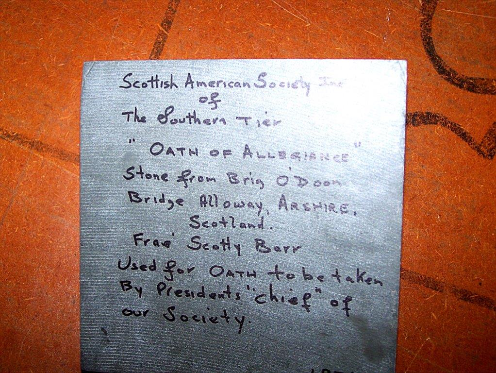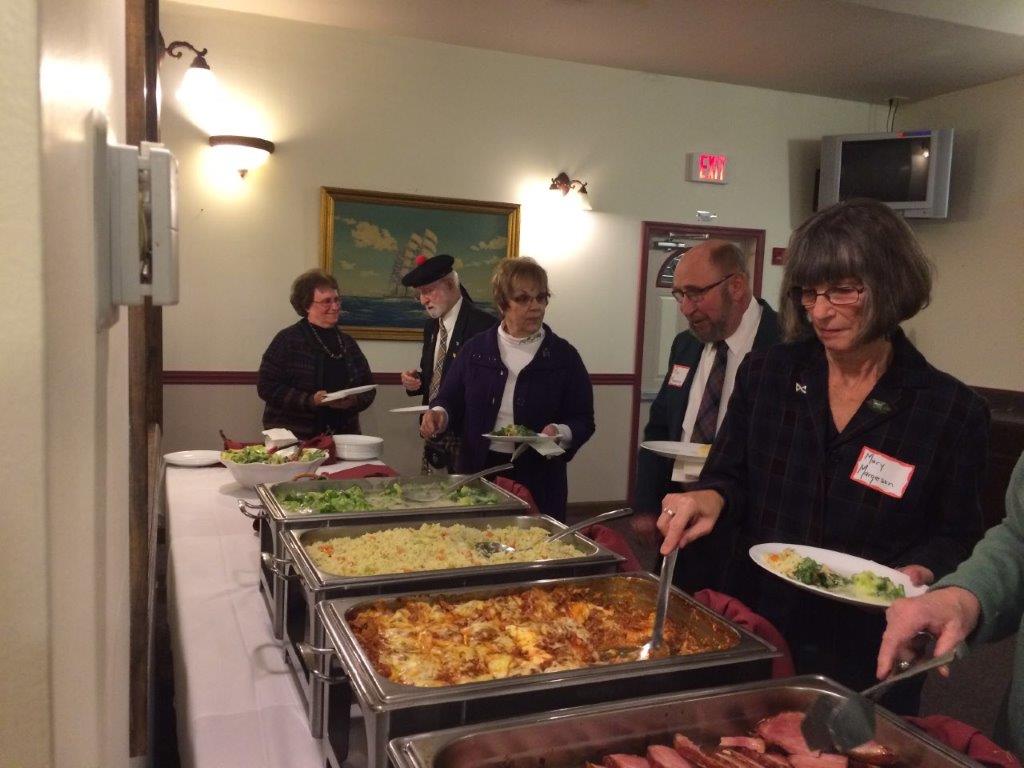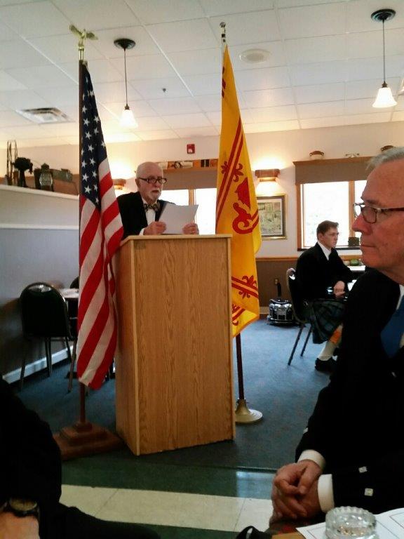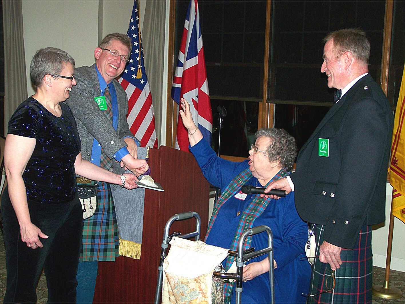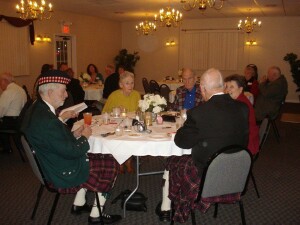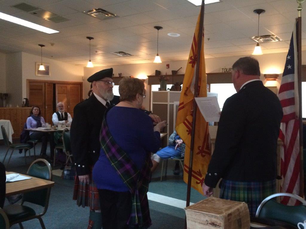 The 2013 St. Andrews Dinner was held at the Corning Elks Club on November 9. After a delicious buffet dinner and the annual business meeting, officers for 2014 were elected and installed, with due pomp provided by Parliamentarian Herb MacDonell, who officiated using the priceless Oath of Allegiance stone from Brig O'Doon!
