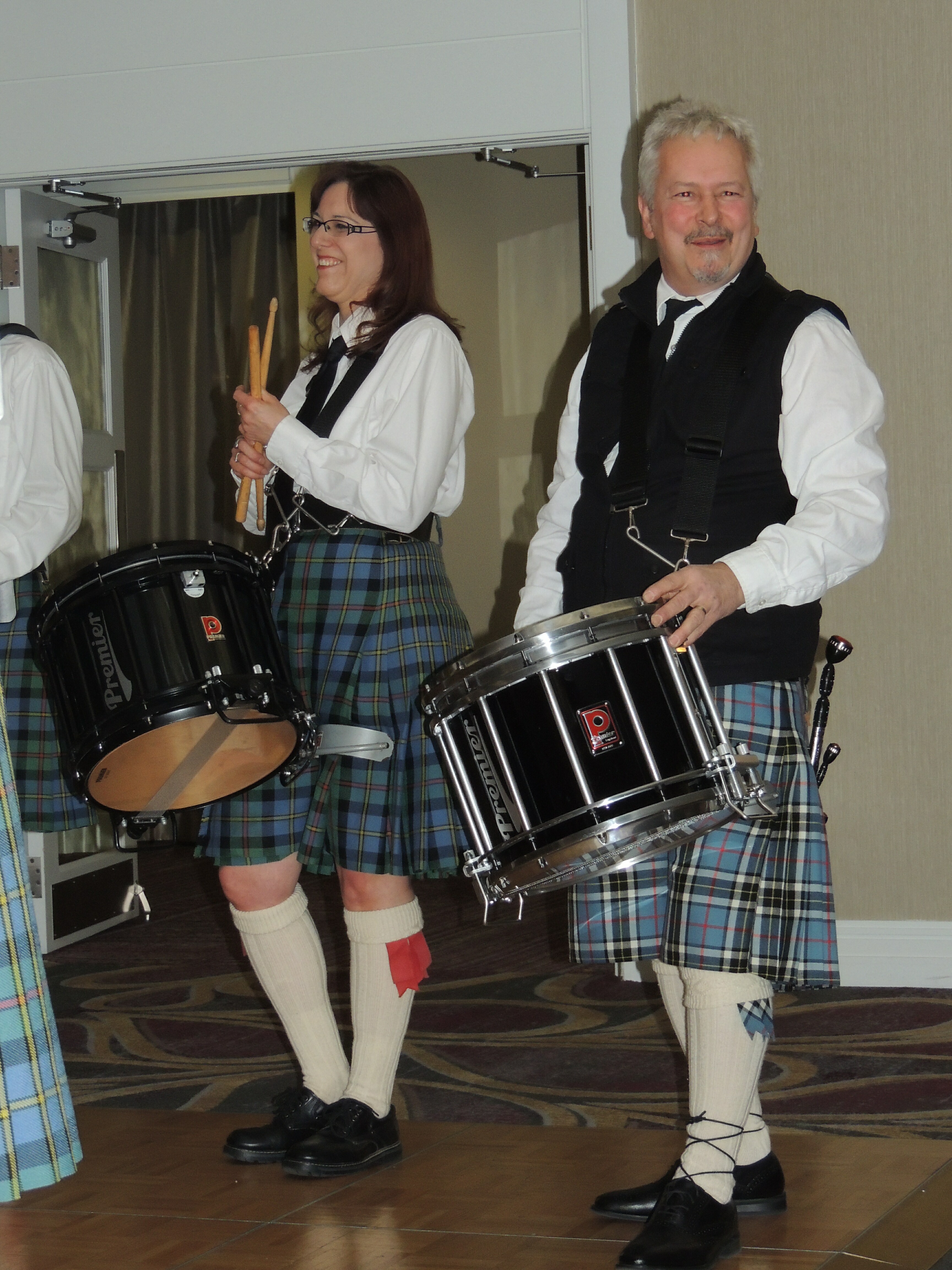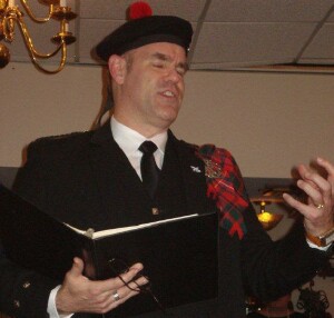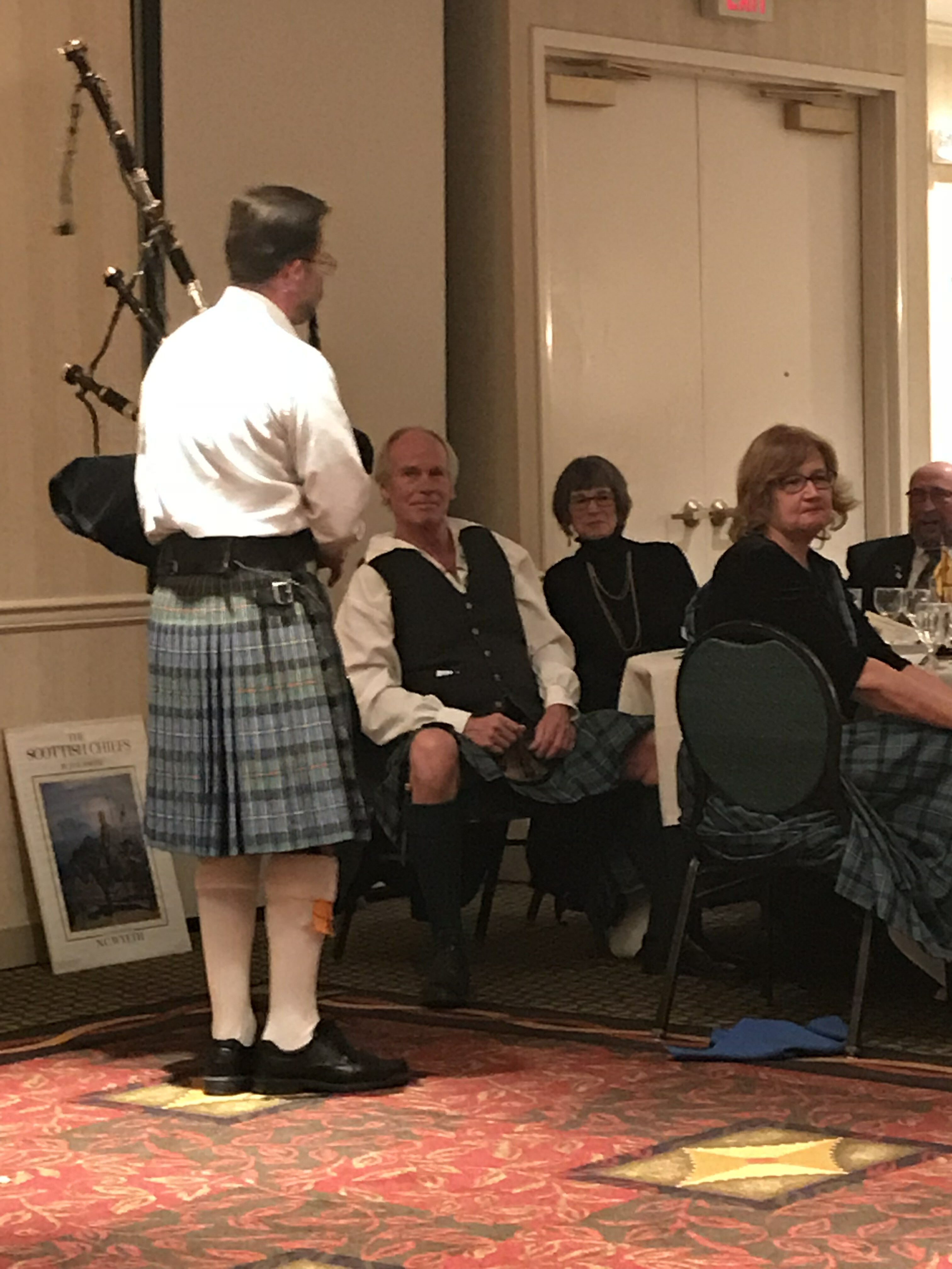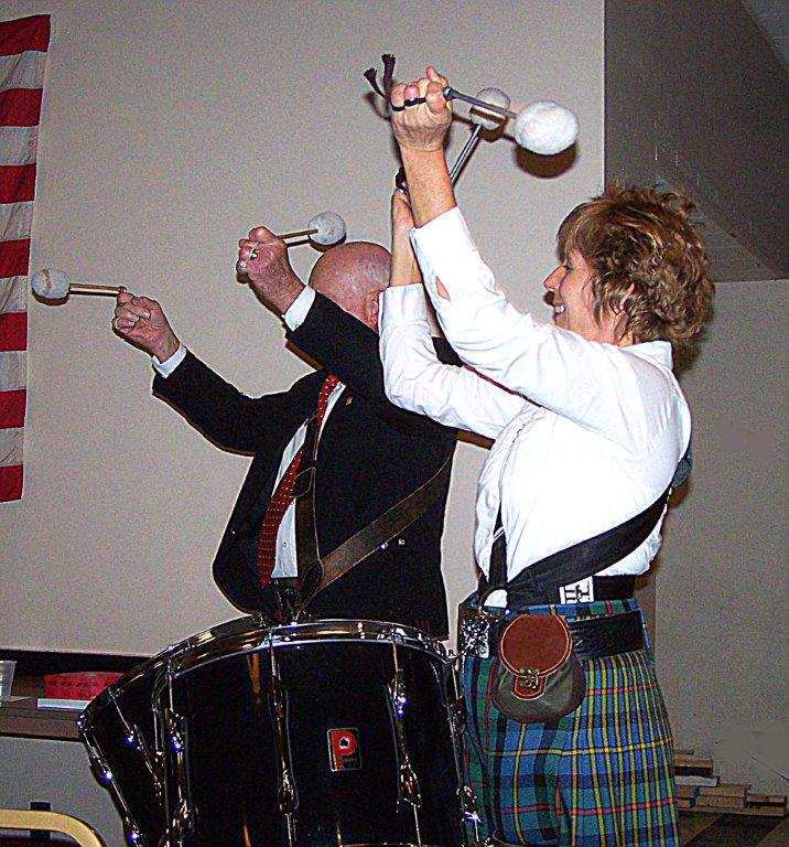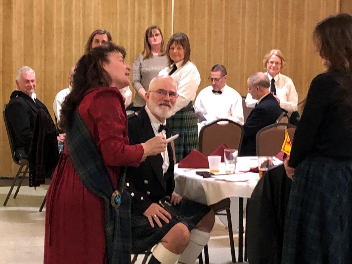 The Drama was followed by a selection of tunes by the Caledonian Pipes and Drums, and the audience was treated to a sprightly reel by the Chief, who vowed to do a repeat performance at the Burns Dinner…finally, Dr. Carl Johengen graced the gathering with comical Scottish folk songs about love and marriage.