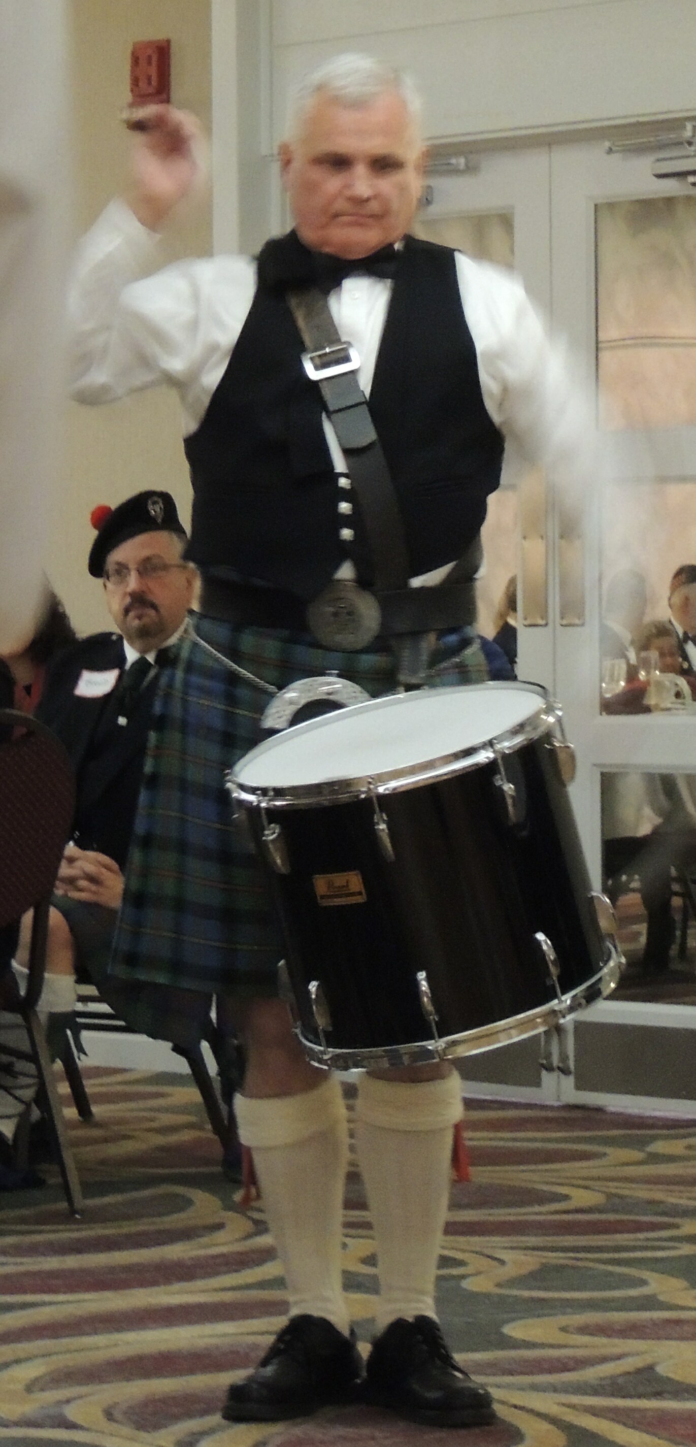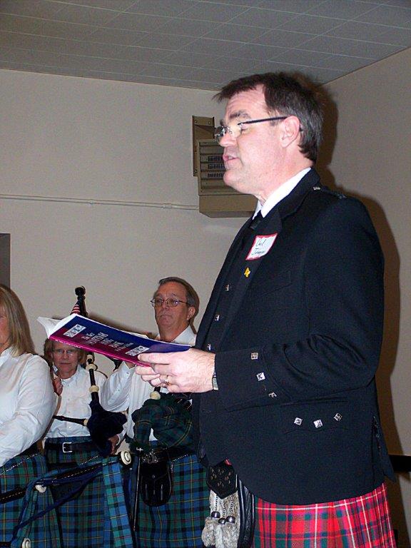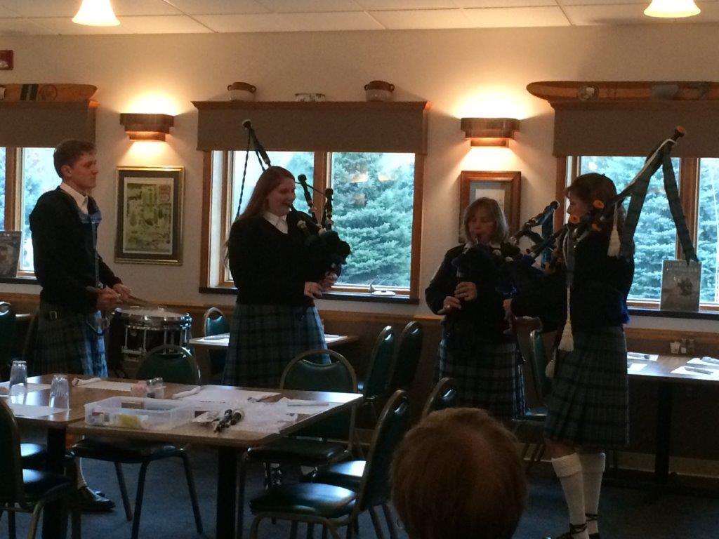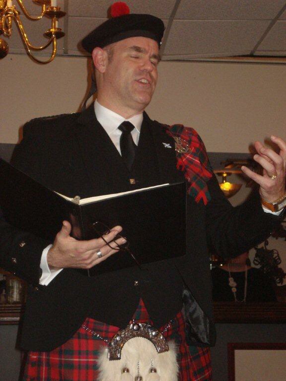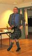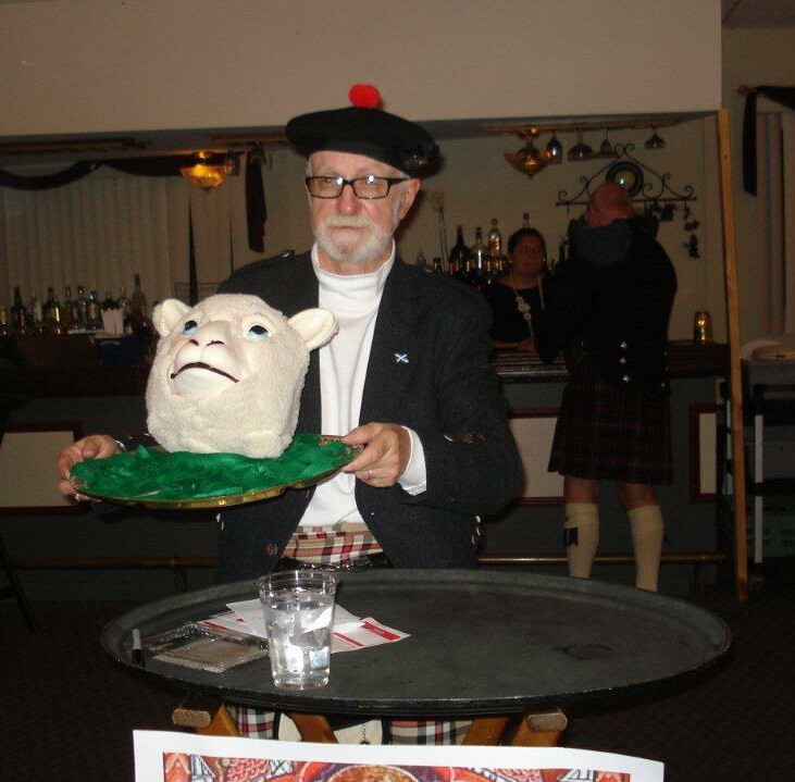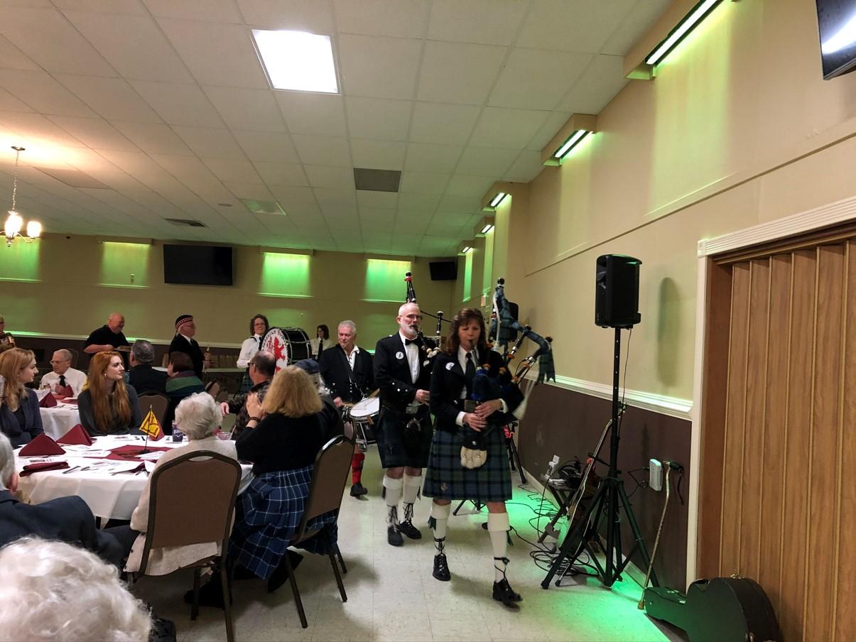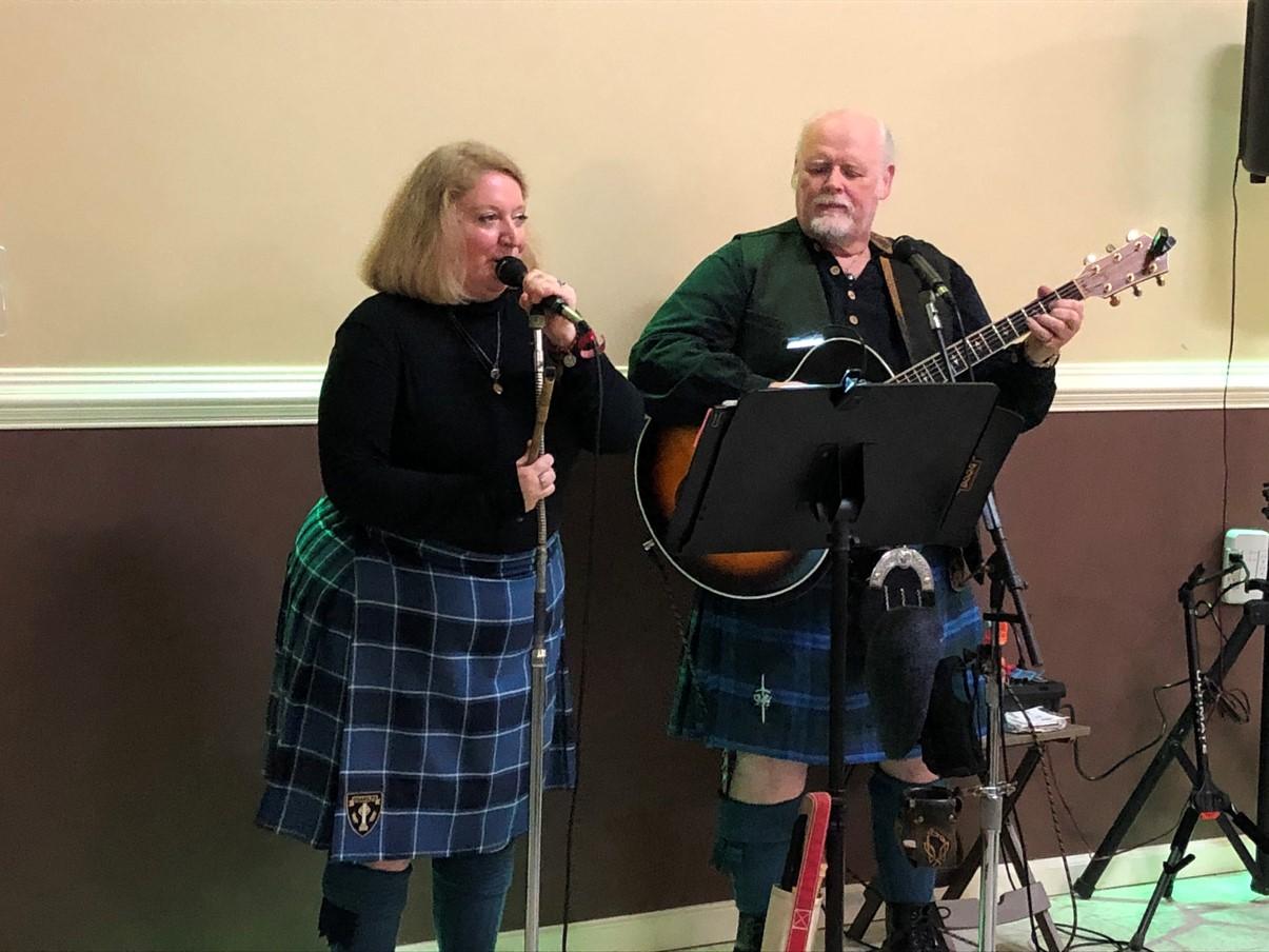 The Drama was followed by a selection of tunes by the Caledonian Pipes and Drums, and the audience was treated to a sprightly reel by the Chief, who vowed to do a repeat performance at the Burns Dinner…finally, Dr. Carl Johengen graced the gathering with comical Scottish folk songs about love and marriage.
