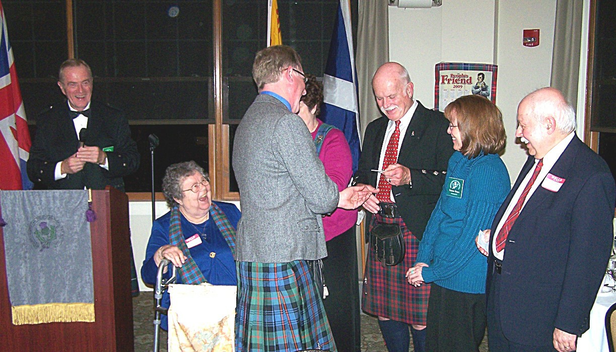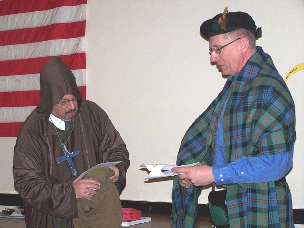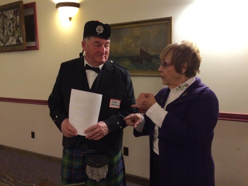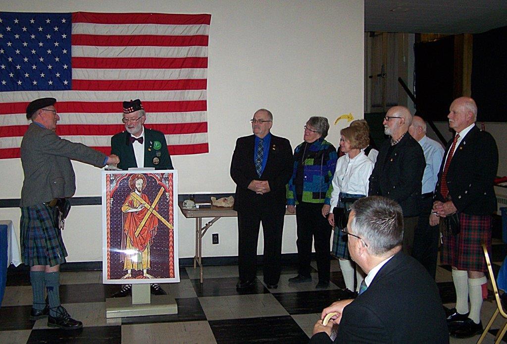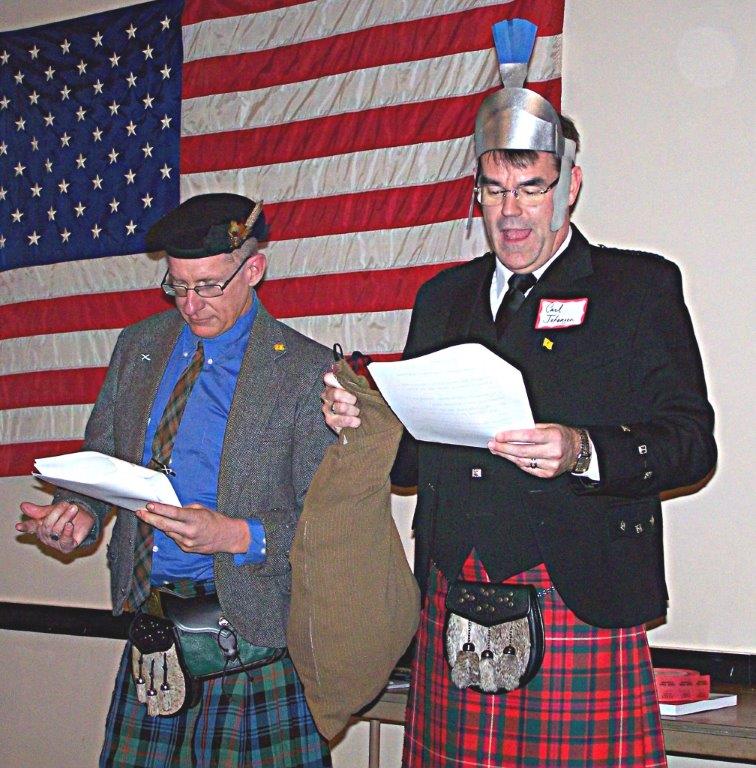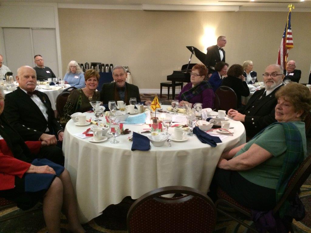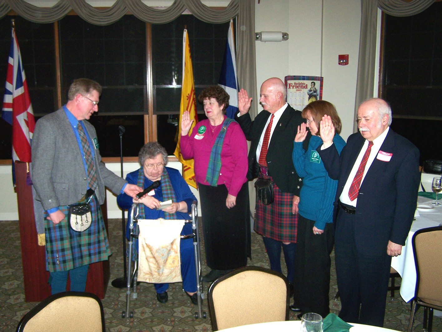 The 2013 St. Andrews Dinner was held at the Corning Elks Club on November 9. After a delicious buffet dinner and the annual business meeting, officers for 2014 were elected and installed, with due pomp provided by Parliamentarian Herb MacDonell, who officiated using the priceless Oath of Allegiance stone from Brig O'Doon!